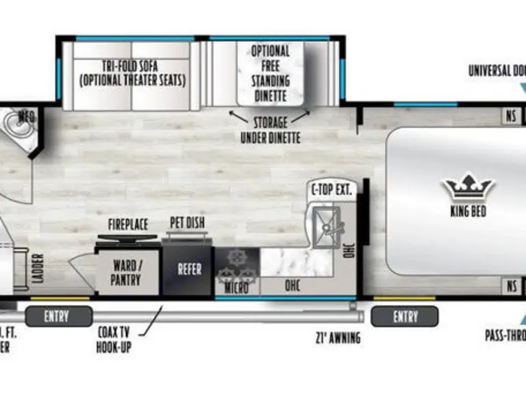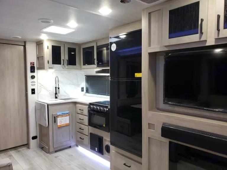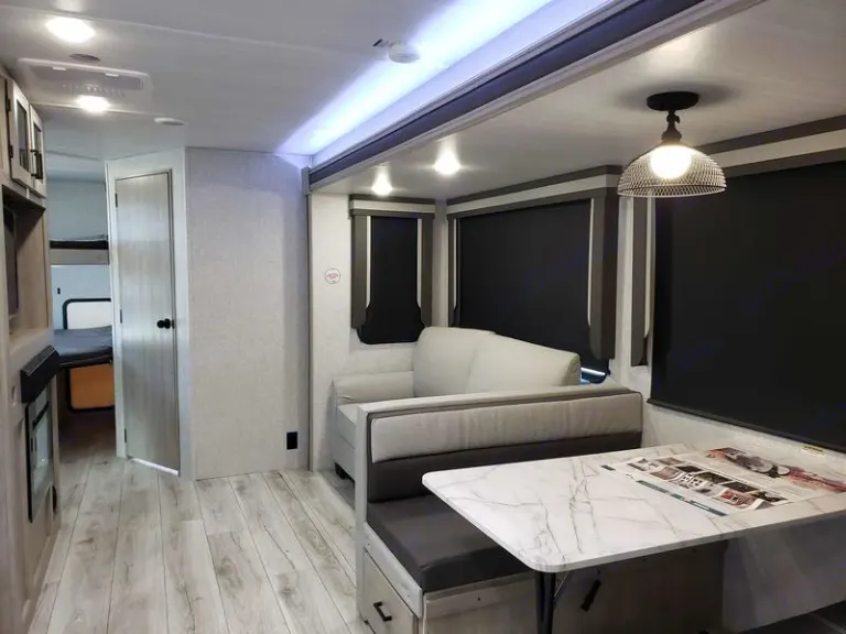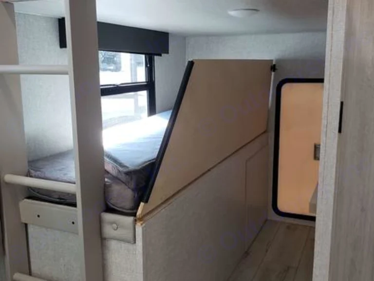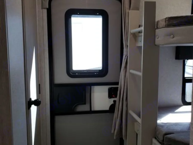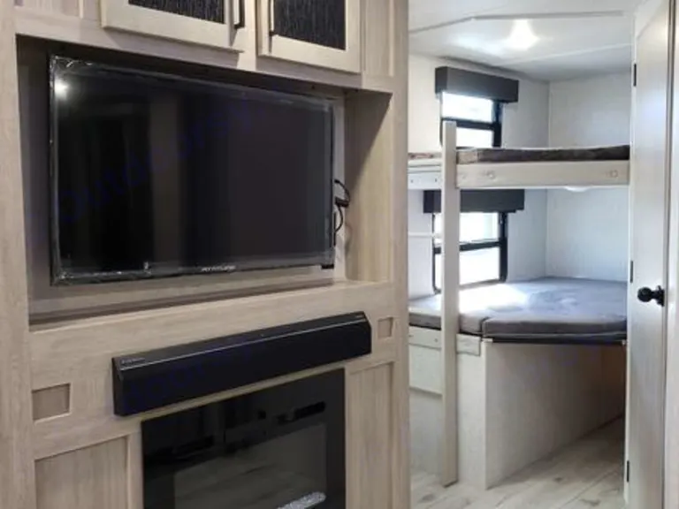 Walk-In Wardrobe/PantryThis is the ultimate family-friendly travel trailer thanks to the double-size bunks with bike storage in the back. A queen bed in the front bedroom will make you feel right at home, plus there are dual wardrobes and dual nightstands for your things. The large slide out in the main living area won't leave you feeling confined, and the tri-fold sofa and booth dinette will provide comfortable seating space. The chef of your group can start lunch on the outside kitchen while the kids grab their scooters from the pass-through storage. And don't forget there is a universal docking station to quickly access your utilities when needed.Each Alta travel trailer by East TO West is constructed with a 5" vacuum bonded roof, flush floor slide outs (where applicable), and diamond plate front rock guard for added protection. Outside, you'll find marine-grade exterior speakers, a universal docking station, and back-up camera prep that can be added to make maneuvering in and out of campgrounds easier than ever. There are USB charging stations for your tablet or phone and designer solid surface countertops you are sure to love. The furnace and 15,000 BTU ducted A/C with quick cool will keep you comfortable in any season, and the 81" interior ceiling height will provide ample space to move about without feeling confined. Start a new adventure in an Alta travel trailer today!Qué incluyeIncluded essentials: linens, pillows, 6 bath towels, 6 wash cloths, 2-3 hand towels, 1 wash cloth for removing make-up, Keurig coffee pot, 6 coffee pods, utensils, grilling tools, plates, cereal bowls, mixing bowls, coffee cups, drinking glasses, RV toilet paper, one roll of paper towels, dish towels, one 2qt pot and a frying pan, small cookie sheet, hand soap and dish soap. See the list of add-ons for this RV.RecomendacionesUniversity Station RV Resort