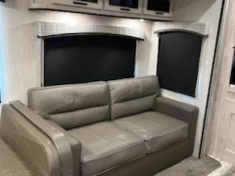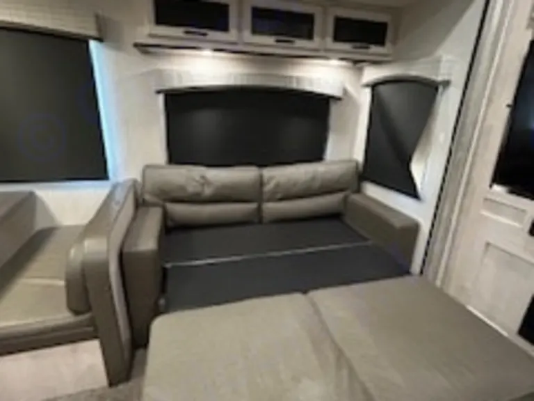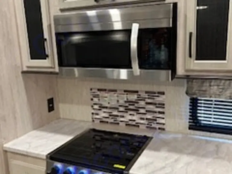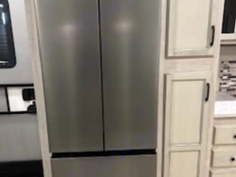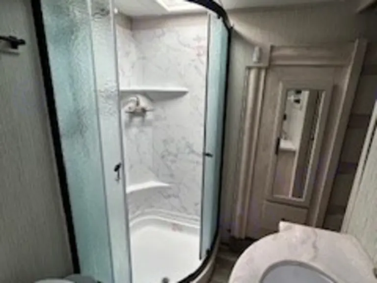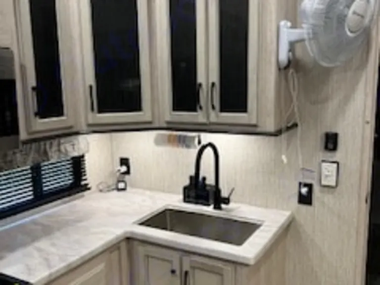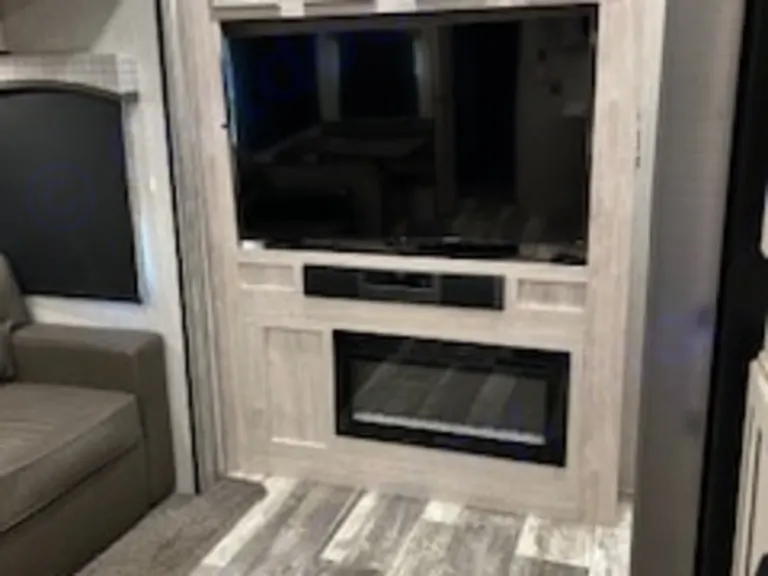 Relaxing Family Size 5th Wheel Camper with versatile spaces. 2 Full bedrooms with 2 Full baths, a Full kitchen with a Full Sized Refrigerator & Freezer. Propane Grill attached. Perfect for short and long term stays.