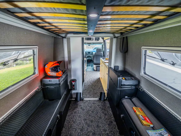 • Queen bed raises to reveal garage space for gear or up to 2 motorcycles