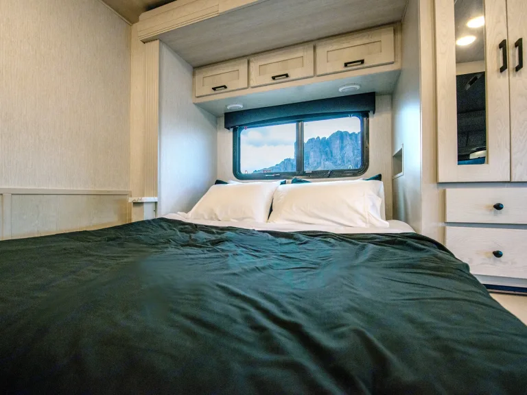The Nexus Triumph 24TS is packed with features that make even the most discerning traveler swoon. The sleek exterior and aerodynamic profile compliment the functional interior: a spacious bathroom, queen sized bed, an over- the -cab bunk for the kids or extra guests, a spacious banquette dining area, a roomy kitchen, high-end finishes throughout and huge storage compartments. From its spacious living area and fully equipped kitchen to its comfortable sleeping quarters and spa-like bathroom, this motorhome has everything you need to live the life of luxury on the road.Sleep