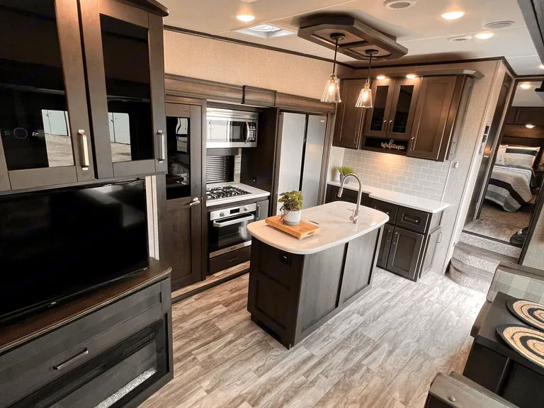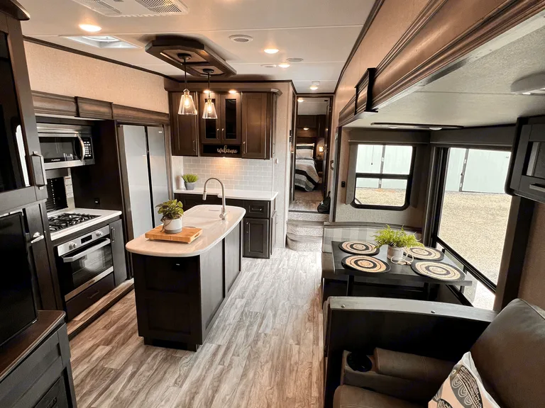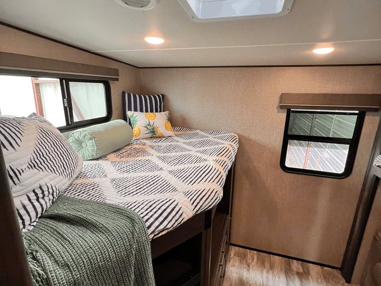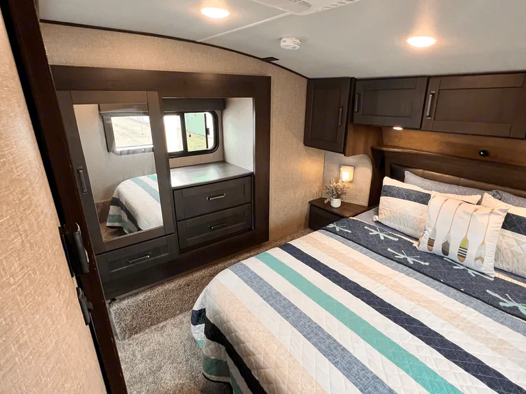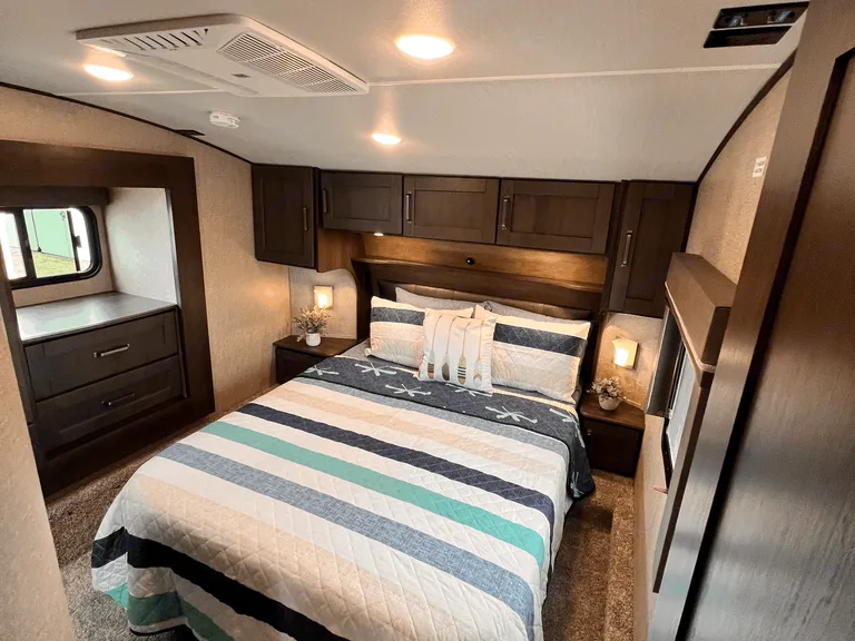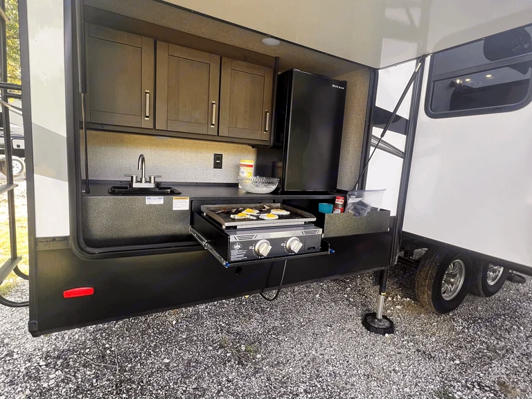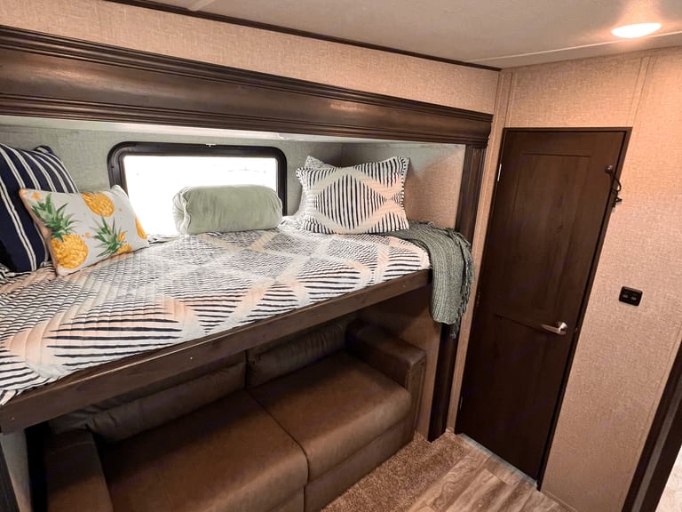 Looking to travel with your family and friends and would like enough space for everyone to be comfortable both during the day and night? Well, step inside using the Axistep, to find a private bunkhouse in the rear of this fifth wheel which offers a slide out flip bunk above a tri-fold sofa, a bunk bed and storage on the opposite side, its very own private half bathroom, and a large rear window for great views. The theater seating or choose the tri-fold sofa option is a great place to unwind at night in front of the entertainment center with a 40" LED Hdtv and fireplace below it. There is a booth dinette or choose a free standing dinette option to dine at, and the kitchen island has a deep, seated stainless steel sink with a high rise faucet with a pull down sprayer to make clean up a breeze too. You will find full amenities including a 16 cu. ft. refrigerator and a hutch. Up the interior steps, you will have a double entry bathroom with a radius shower with a skylight, and you can wake up refreshed each morning after sleeping on your own queen bed.Qué incluyeFully stocked : Sheets, blankets, pillows, towels, cleaning supplies, 4 camping chairs, outside table, plates, Bowls, silverware, pots/pans, cooking sheets, cutting board, cooking utensils, coffee pot with filters, knives, TV with wifi antenna (must be connected to wifi or smart phone), propane for grill and heater, AC units to handle Texas summer, 2 retractable awnings, stereo system, portable ice maker, full size freezer /fridge, outdoor fridge and griddle, RecomendacionesBring food/seasonings, drinks, bathroom soaps, sunscreen and a good attitude.