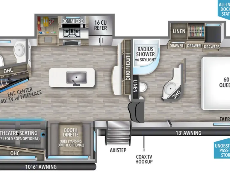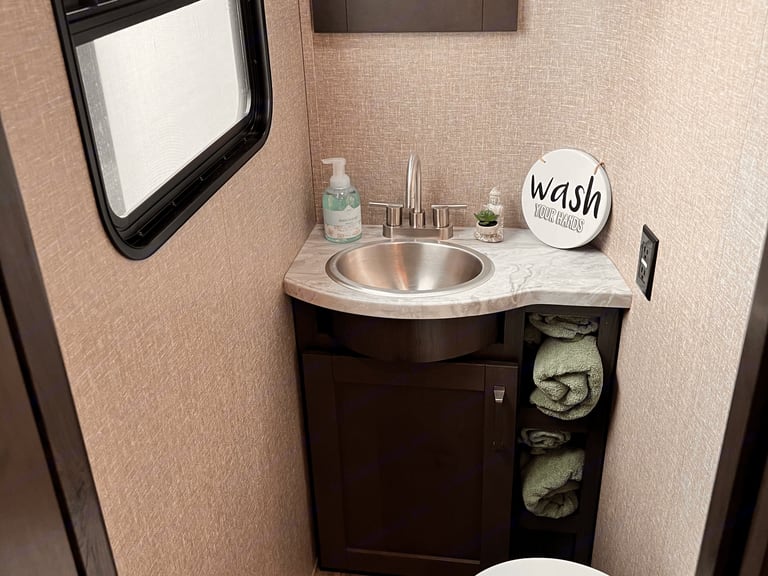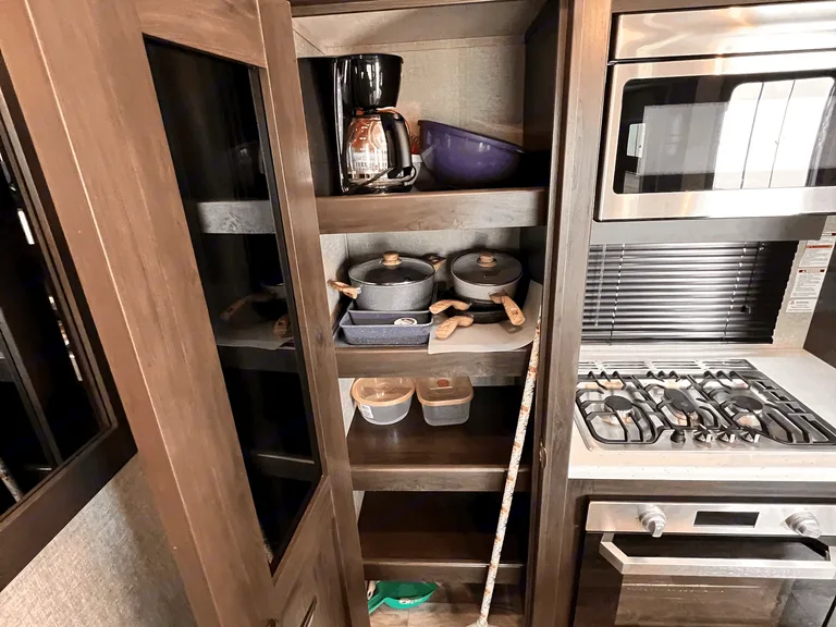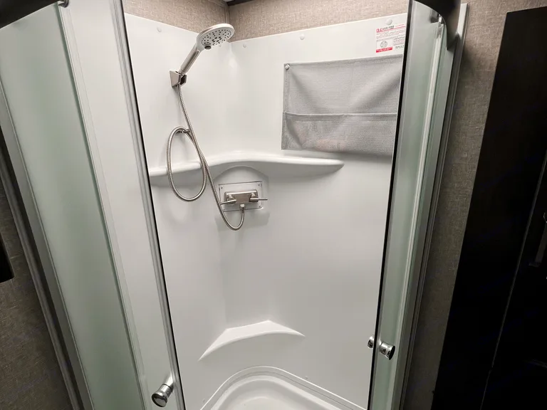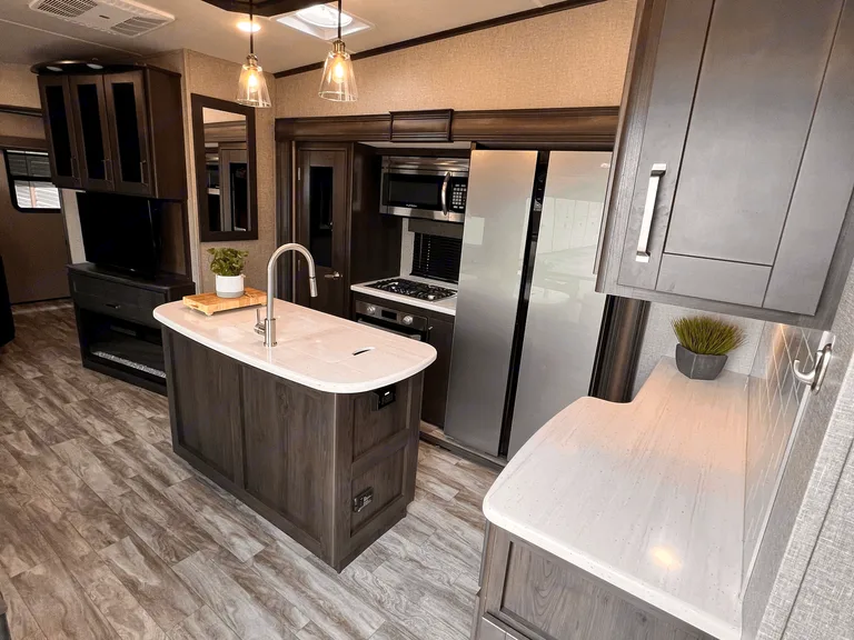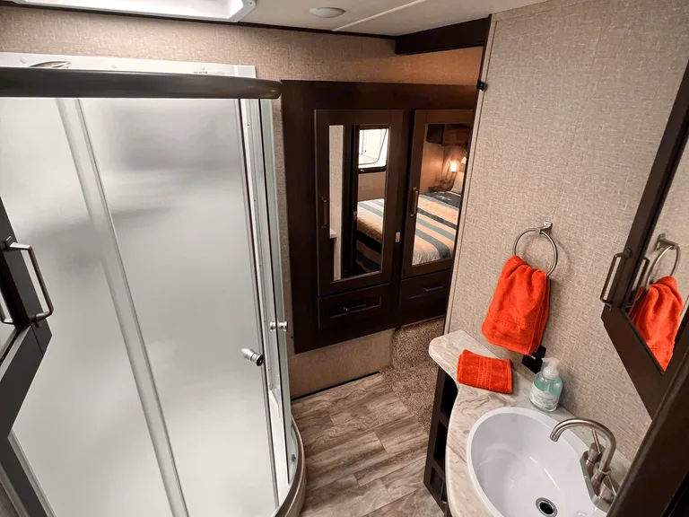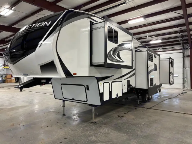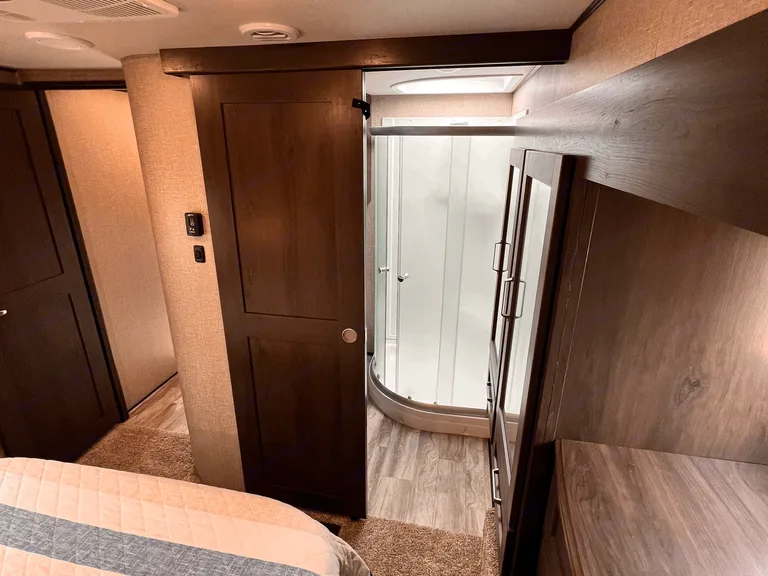 Looking to travel with your family and friends and would like enough space for everyone to be comfortable both during the day and night? Well, step inside using the Axistep, to find a private bunkhouse in the rear of this fifth wheel which offers a slide out flip bunk above a tri-fold sofa, a bunk bed and storage on the opposite side, its very own private half bathroom, and a large rear window for great views. The theater seating or choose the tri-fold sofa option is a great place to unwind at night in front of the entertainment center with a 40" LED Hdtv and fireplace below it. There is a booth dinette or choose a free standing dinette option to dine at, and the kitchen island has a deep, seated stainless steel sink with a high rise faucet with a pull down sprayer to make clean up a breeze too. You will find full amenities including a 16 cu. ft. refrigerator and a hutch. Up the interior steps, you will have a double entry bathroom with a radius shower with a skylight, and you can wake up refreshed each morning after sleeping on your own queen bed.Qué incluyeFully stocked : Sheets, blankets, pillows, towels, cleaning supplies, 4 camping chairs, outside table, plates, Bowls, silverware, pots/pans, cooking sheets, cutting board, cooking utensils, coffee pot with filters, knives, TV with wifi antenna (must be connected to wifi or smart phone), propane for grill and heater, AC units to handle Texas summer, 2 retractable awnings, stereo system, portable ice maker, full size freezer /fridge, outdoor fridge and griddle, RecomendacionesBring food/seasonings, drinks, bathroom soaps, sunscreen and a good attitude.