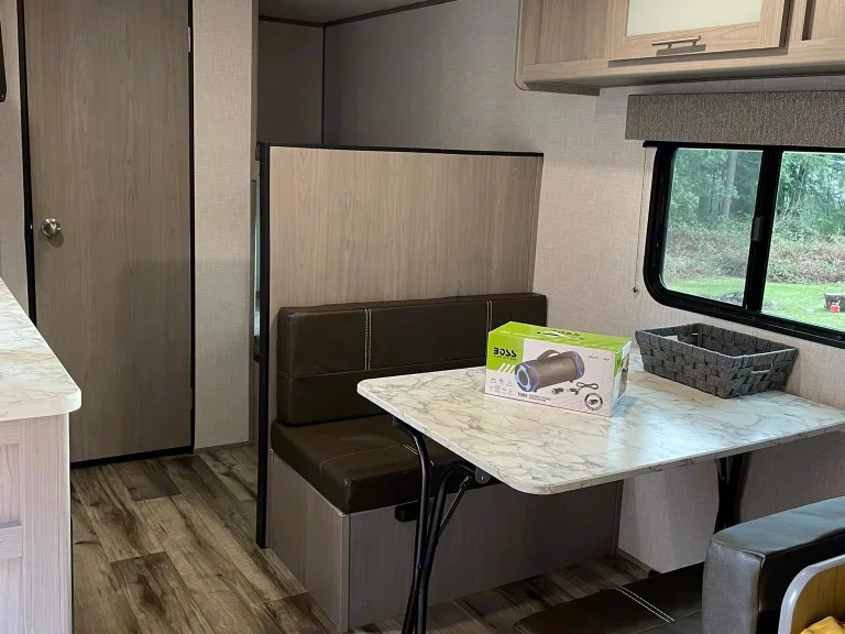 Allow yourself to relax and unwind with the outdoor awning, connect to the Boss Audio speaker provided for both indoor and outdoor sound and enjoy! The Honey Bug is very user friendly, super cute and cosy camper, that will surely be the highlight of your adventures!- Storage under all beds and seating areas