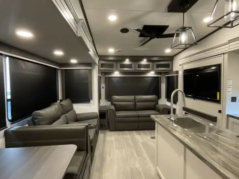 The 2025 Keystone Cougar 360MBI is a spacious fifth wheel designed to accommodate the needs of larger families or groups, comfortably sleeping up to eight people. Its intelligent floorplan maximizes livable space while providing a luxurious camping experience. Upon entry, you'll be greeted by a beautifully appointed living area featuring a generous sofa and a theater seat for relaxation, ideal for family gatherings or movie nights.The well-equipped kitchen is a chef's delight, with a large island, modern appliances, and plenty of counter space, making meal preparation a breeze. A dedicated dining area allows for enjoyable family meals, while the adjacent pantry provides ample storage for all your essentials. The master bedroom is a serene escape, featuring a king-size bed and plenty of closet space, ensuring a restful night's sleep.In place of a traditional bunkhouse, this model offers a versatile loft equipped with an office space, perfect for those who need to balance work and play while on the road. The bathroom is conveniently located and features a full-sized shower for added comfort. Externally, the Cougar 360MBI showcases a sleek design with an outdoor kitchen and entertainment area, enhancing your outdoor living experience. With its combination of style, functionality, and comfort, the 2025 Keystone Cougar 360MBI is perfect for those seeking adventure without sacrificing the comforts of home.