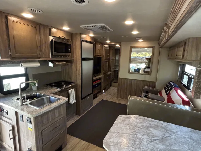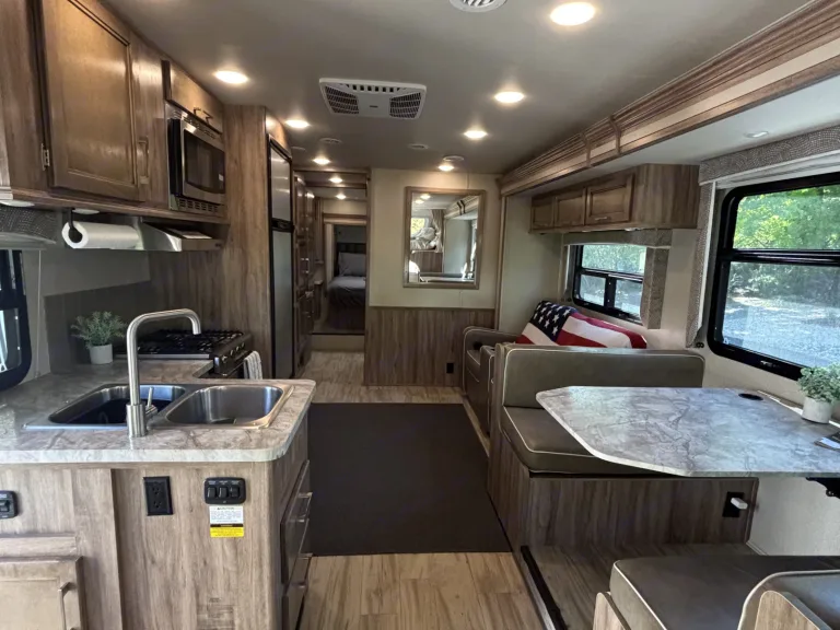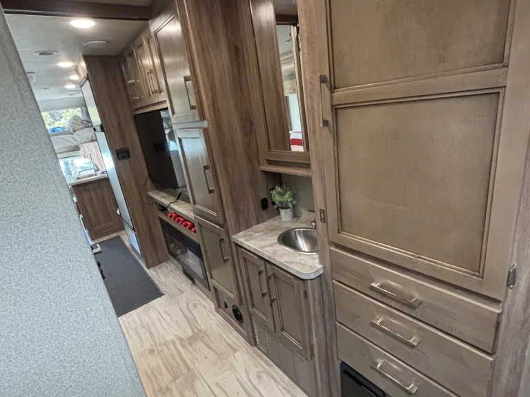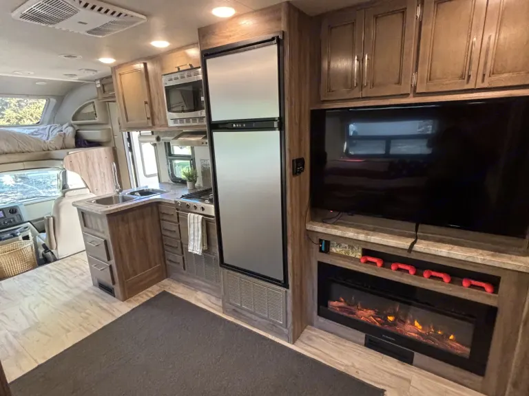 • Modern Kitchen: Cook delicious meals on the road with a 3-burner stove, oven, microwave, full refrigerator/freezer, and plenty of counter space.