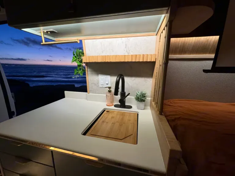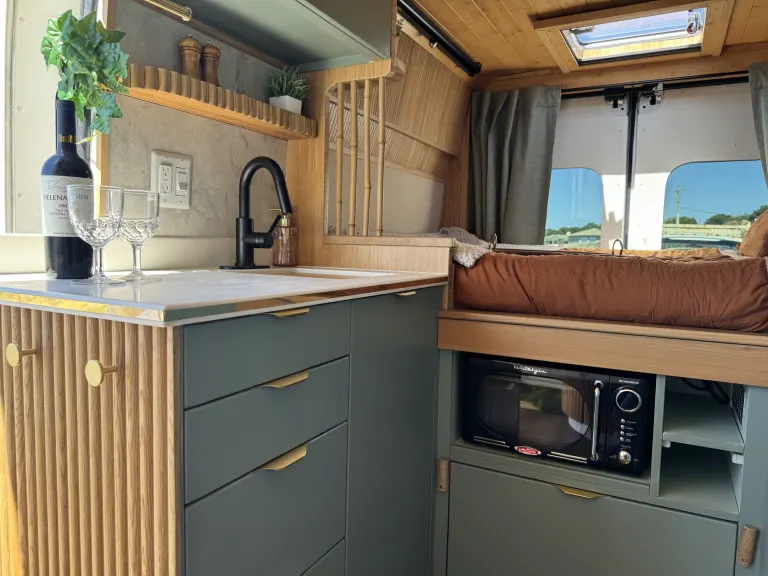 Inside, you’ll find everything you need for an unforgettable getaway: a full-sized bed with fresh linens, a skylight for stargazing, a solar-powered fridge, butane stove, microwave, and a Bialetti Moka Express for your morning coffee. A Laveo dry-flush toilet and a sink with running filter water keep things easy and hygienic, while blackout curtains and warm wood accents make it feel like your own private cocoon.When the sun sets, stream your favorite shows on the projector with Roku TV, listen to music on the Bose Bluetooth speaker, or challenge your travel partner to a board game. In the morning, grab the included beach chairs and enjoy your coffee with your toes in the sand.Choose your adventure:Have the van delivered and set up at a stunning beachside location.