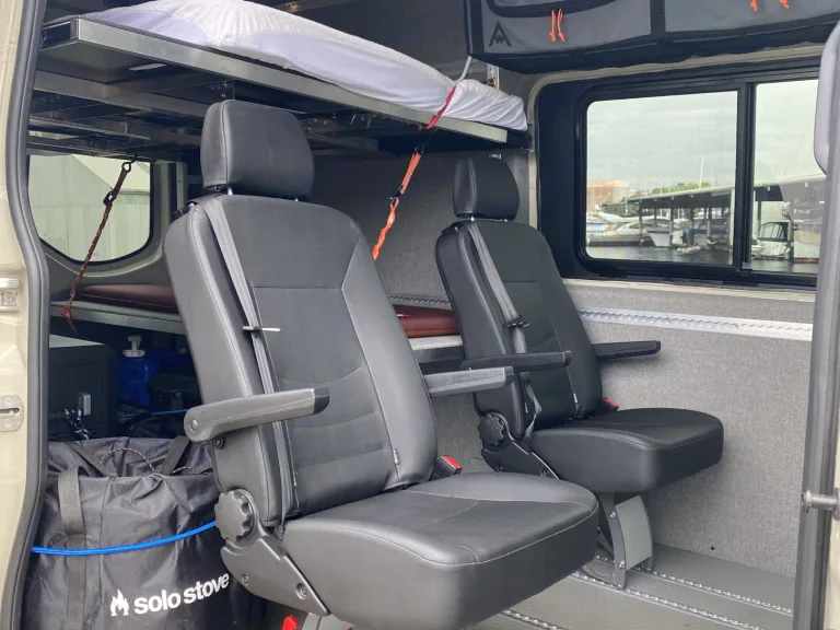 2023 Mercedes Sprinter Camper Van with seating and sleeping for 4-5 (depending on age/size). The van comes with all the essentials for your outdoor adventures.