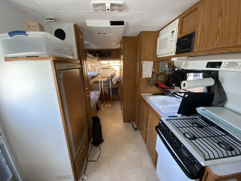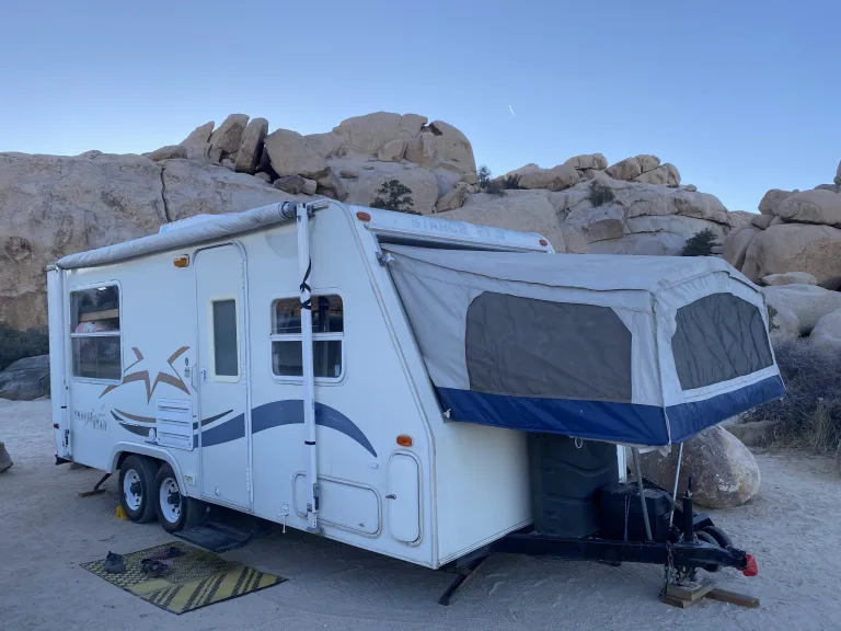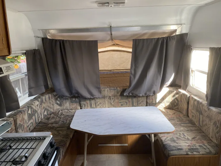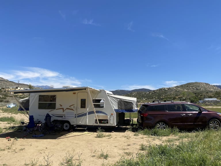 3,000 lb hybrid travel trailer can be pulled by most minivans and SUVs. Convertible bunkbeds can either have three bunks or two. (Let me know ahead of time which configuration you prefer) Three bunk configuration doesn't have much head room, so may be better for kids. Bottom bunk bed converts into a dinette that seats two. Larger dinette which seats five converts into a queen size bed. Front pop out is a queen size bed. Rear pop out is a full size bed.Everything works great. Fridge and hot water heater run off of both electric and gas. Gas heat built-in and electric space heater provided. Air conditioner is land power only.Tongue height is 15.5”.Qué incluye2 adult and 2 child camp chairs.
