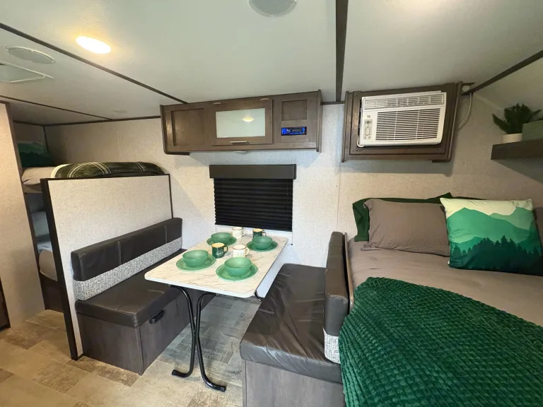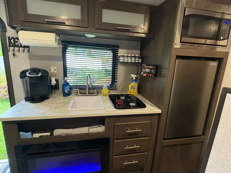 Rain or Shine Retreat – Cozy Up in Our Beautiful 2021 Coleman LanternWelcome to your perfect PNW adventure base! Our 2021 Coleman Lantern isn’t just a travel trailer—it’s a tiny cabin on wheels thoughtfully decorated to make you feel relaxed the moment you step in.Whether you’re planning a cozy weekend by the coast, a mountain getaway, or a spontaneous escape from the city, this trailer is ready for it all—rain or shine.Room for Everyone! With bunk beds, a convertible dinette, and the main Queen bed, this camper comfortably sleeps up to 5-6—perfect for couples, small families, or best friends.• Fully Stocked Kitchen: Make coffee with the Keurig (pods included!), cook up meals with the stove and microwave, and enjoy a full spice rack to make your dishes feel like home.• Warm & Inviting Bathroom: Yes, there’s an indoor bathroom with spa-style touches, fluffy towels, and thoughtful storage.• Creature Comforts: Enjoy the A/C on warm days, a cozy fireplace on chilly nights, a mounted TV with Bluetooth audio.• Thoughtfully Prepared: From toilet paper to cleaning supplies, dishes to spices, everything you need is included so you can focus on relaxing.Extras: