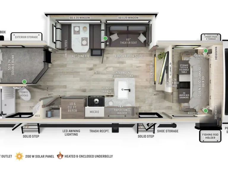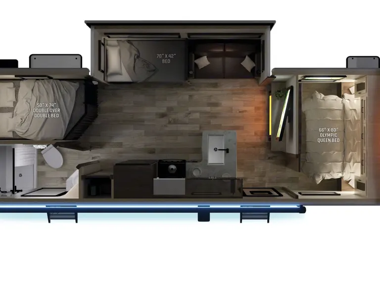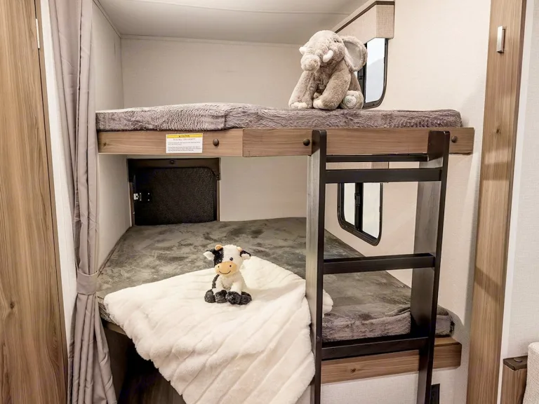 Queen bed, convertible dinette, and bunk space (if applicable to your floor plan)