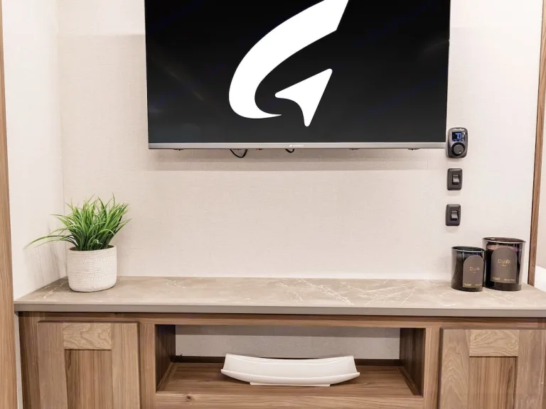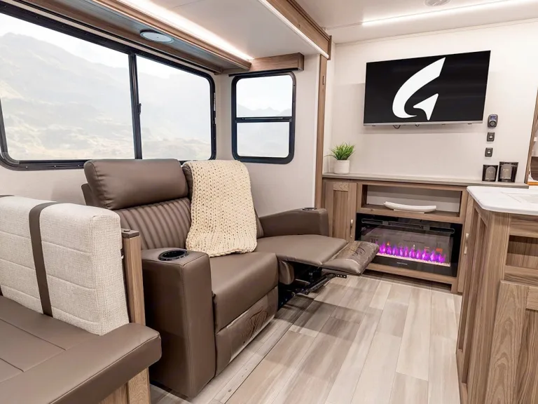 Inside, you’ll find a spacious, modern interior with a fully equipped kitchen, comfortable sleeping areas, and a convertible dinette for added flexibility. The bathroom offers a full shower, vanity, and plenty of storage so you can travel without compromise.