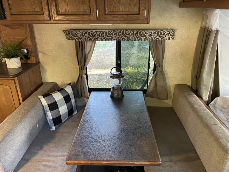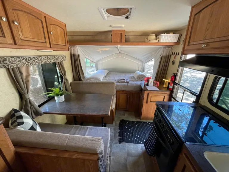Upper Napa Valley Based - Clean and cozy, with private sleeping pods in this pop out RV. We are the closest to Bothe and can drop of/setup for you. Three comfortable queen beds with partitions that close off. Each bed pod has canvas walled sides so you feel a little bit closer to nature in beautiful Napa Valley. This also allows for more ambient light and air movement on warm days. Qué incluyeComes ALL CLAD pots & pans, coffee pour over/filters, coffee mugs, and basic kitchen needs (plates, bowls, cups, mixing bowl, utensils, spatula, can opener, measuring cups/spoons, knives, cutting boards, paper towels, dish soap, sponge, etc.)Shampoo, conditioner, body wash, soap, and toiler paper in the bathroom, bath towels, hand towels, and wash cloths are in the bathroom.