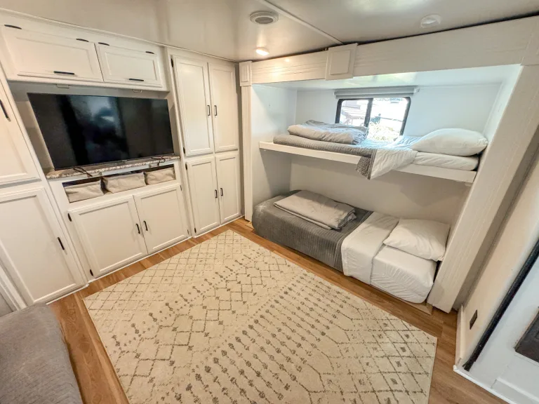 Beautifully decorated and renovated, large/spacious RV that sleeps 8 adults comfortably (up to 10 total). Three separate TVs throughout the home for personal space and enjoyment. A large kitchen/dining room area with couch to host inside, as well as an outdoor sound system + awning + light for hosting in the evening or in nice weather. Strong A/C for hot days, plenty of hot water for showers and fridge/freezer space. Outdoor shower if you rent near lake/beach to rinse sand off. Must see to believe, total glamping! Perfect for any beach, racing event, general outdoors setting, or Disney World camping at an affordable rate that lets you be in nature, but with all the comforts of home!