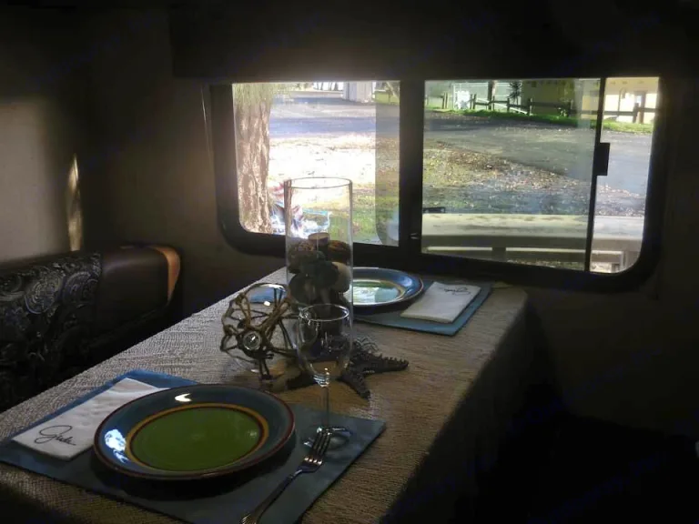 It is fully equipped with a queen-sized bed, two nightstands with drawers and lots of overhead storage and lighting. There is a large storage area under the queen bed that has all your extra linens and blankets. It also has windows on either side with pull-down blinds for privacy and shade. There is a smart TV that swivels, which can be watched from your queen bed or bunk beds, kitchen, and breakfast area. The bunk beds sleep 2. The top bunk and lower bunk each has a window with a curtain and a pull-down blind, as well as a light and shelf for personal use. This rig has a slide-out that becomes the breakfast area (booth) with storage under each seating. The table converts to a bed that sleeps 1. There is lots of storage space overhead. Wide windows, with curtains and a pull-down blind, provide lots of light into the trailer. It is a great way to watch the sun as it sets from inside. The kitchen has a full-sized refrigerator, microwave, stove, ventilation, lots of overhead storage for dishes, counter space, and sink. There is also lots of drawers for all your kitchen essentials and cabinets on the bottom. It also has a full-sized pantry. This rig is fully equipped with a shower stall, toilet, sink, medicine cabinet, and lower cabinet. There is also a skylight with ventilation. There are tons of storage space underneath, that can be accessed from inside as well as outside. They are perfect for all your adventure gear. A remote-control music system, with inside and outside speakers, that you can use via Bluetooth from your smart devices. A/C, water heater, retractable LED awning, 2 gas tanks, water and sewer hoses, leveling blocks, wheel covers. Experience the great outdoors in this comfortable and fully quipped travel trailer.Qué incluyeAll kitchen essentials: pots, pans, plates, cups, glasses, utensils, steak knives, cutting board