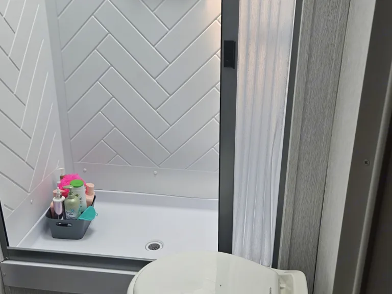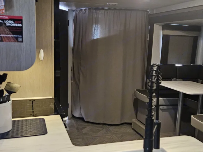 The bathroom includes a shower and a separate entrance/exit door, providing convenience and easy access.Kitchen: