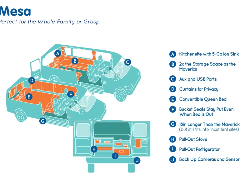 Perfect for 2-3 adults, families, or those who just like to stretch out. Sleeps 5 if you add the rooftop sleeper.A mileage deposit is required for every rental. The deposit and the per mile rate is charged according to your van model. For the Mesa, the $33/day deposit covers 100 miles per day, averaged over your trip. Excess miles are charged or unused miles are refunded at $0.33 cents per mile.At Escape, we like to make things as simple and easy as possible for you to book the trip of a lifetime. Our straightforward insurance options help give you peace of mind so that you can make the most of your vacation. We offer six different insurance options that can be added after booking and altered until pickup.Details:
