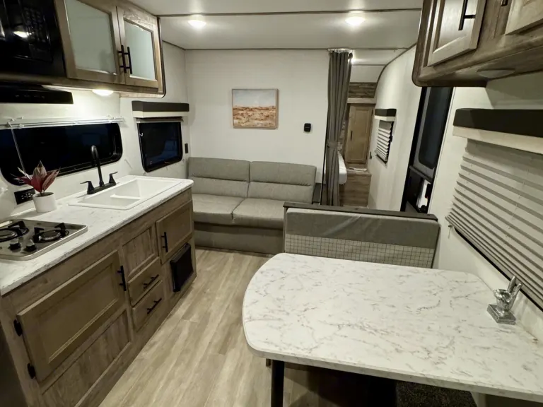 This cozy camper sleeps 4 adults or 2 adults with 4 kids (depending on how much you like each other). Comes stocked with kitchen essentials, chairs, bedding, and toiletries – just bring your snacks and your sense of adventure.We have a total of 7 campers we rent out. If you need something different or want to rent multiple campers let us know!We’ll deliver, set up, and tear down for you, so all you have to do is show up, relax, and make those camping dreams come true. Qué incluye• Bedding for bed only. If you plan on sleeping on the dinette and couch you will want to bring your own bedding.