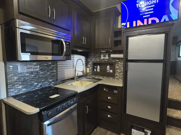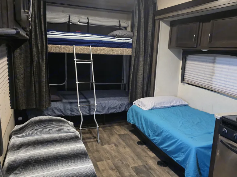 •When dry camping, or camping without hookups, be mindful of fresh water and sewage usage. If not rationed properly, the fresh water can run out, and the sewage can reach capacity before the scheduled end of your trip. Grey water from showers and sinks usually fill up the quickest. Most guests average 4-5 days before reaching capacity. There are internal gauges to monitor usage. Guests are responsible for any mid trip replenishment and/ or draining required.