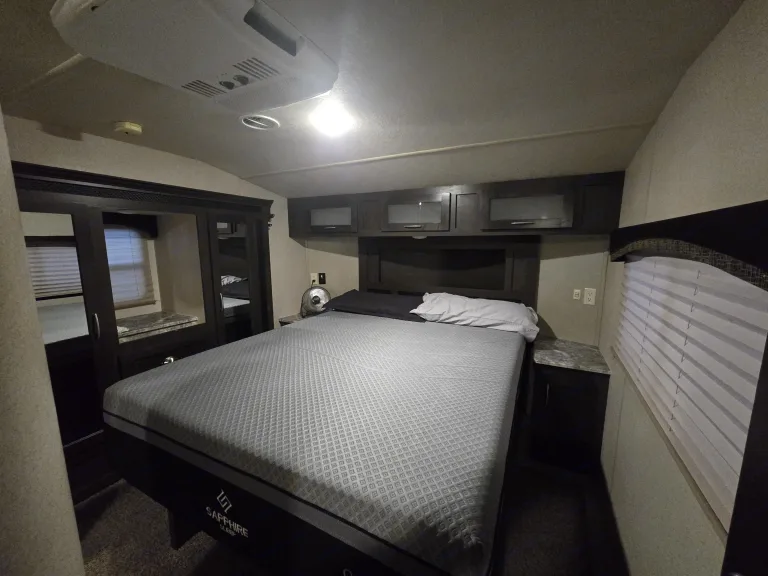 Skip the setup and stress when you hit the dunes in comfort with this well-maintained 2018 Shockwave 5th wheel toy hauler with available Starlink. Built for off-grid camping and desert adventures, it’s fully equipped and delivered to Glamis, Picacho, or wherever your crew rides.Sleeps 5–6 ComfortablyBlackstone griddle and Fire TV stick includedPrivate Master Suite (Upstairs):